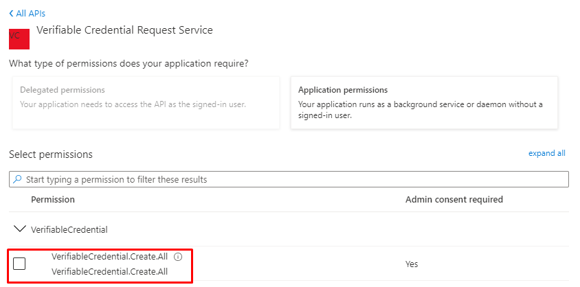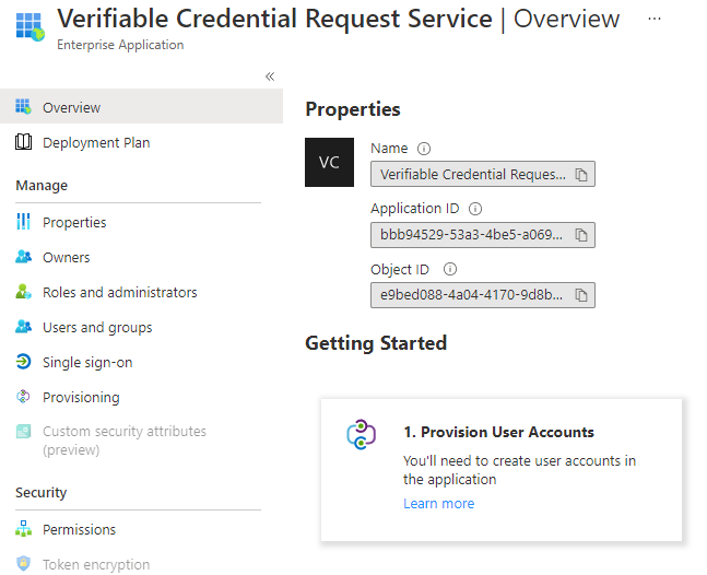 # These commands install and import the Az module if ((Get-Module -ListAvailable -Name "Az.Accounts") -eq $null) { Install-Module -Name "Az.Accounts" -Scope CurrentUser } if ((Get-Module -ListAvailable -Name "Az.Resources") -eq $null) { Install-Module "Az.Resources" -Scope CurrentUser } # Replace <your-tenant-ID> with your Azure AD tenant ID Connect-AzAccount -TenantId <your-tenant-ID> # The AppId bbb94529-53a3-4be5-a069-7eaf2712b826 refers to the Verifiable Credentials Microsoft service. New-AzADServicePrincipal -ApplicationId "bbb94529-53a3-4be5-a069-7eaf2712b826" -DisplayName "Verifiable Credential Request Service" # You can check the Enterprise application with the following get-AzADServicePrincipal -ApplicationId bbb94529-53a3-4be5-a069-7eaf2712b826Or You can check the Application from Enterprise applications.