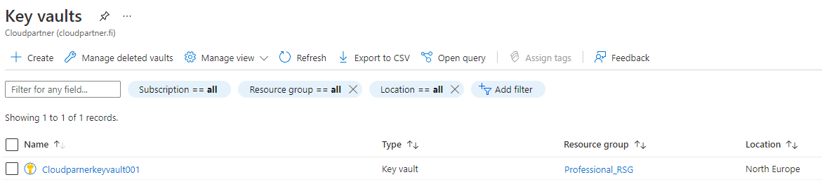# Choose a name, Resource group and geographical location New-AzKeyVault -Name Cloudparnerkeyvault001 -ResourceGroupName "Professional_RSG" -Location "North Europe"