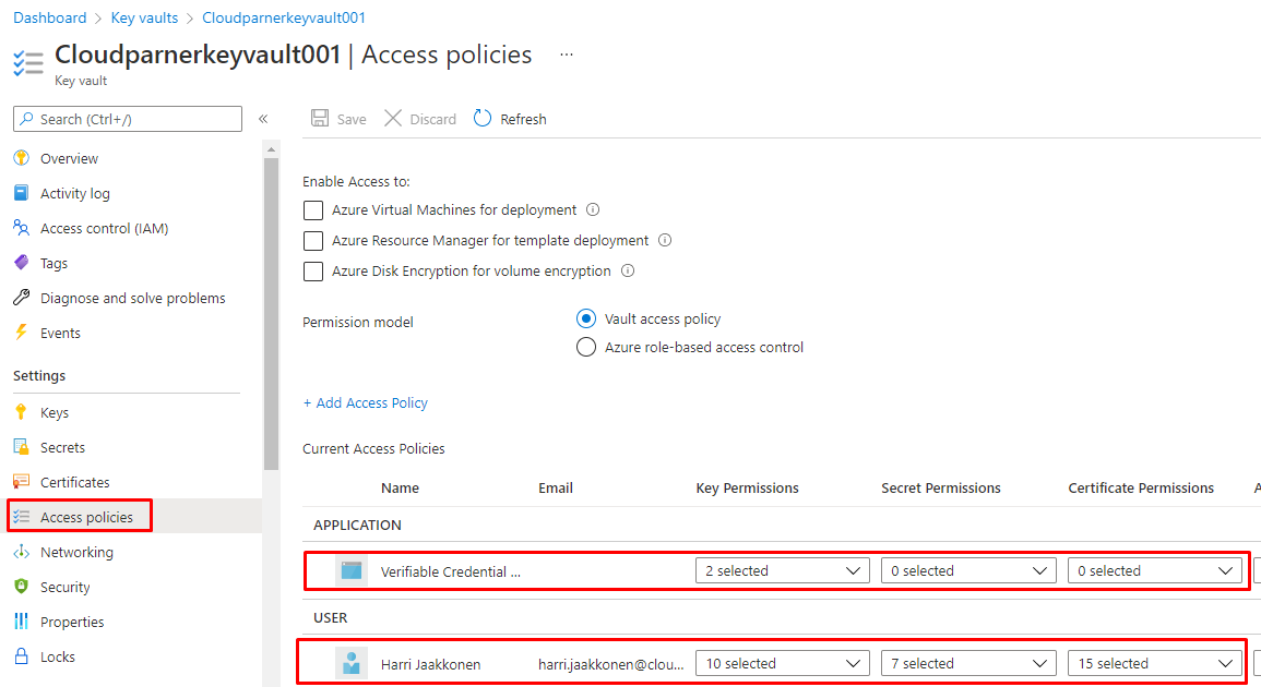 # Setting right permissions for Your user to Key vault Set-AzKeyVaultAccessPolicy -VaultName "Cloudparnerkeyvault001" -UserPrincipalName firstname.lastname@domain.fi -PermissionsToKeys get,list,update,create,import,delete,recover,backup,restore,sign # And rights for the Service Principal Set-AzKeyVaultAccessPolicy -VaultName "Cloudparnerkeyvault001" -UserPrincipalName bbb94529-53a3-4be5-a069-7eaf2712b826 -PermissionsToKeys get,sign