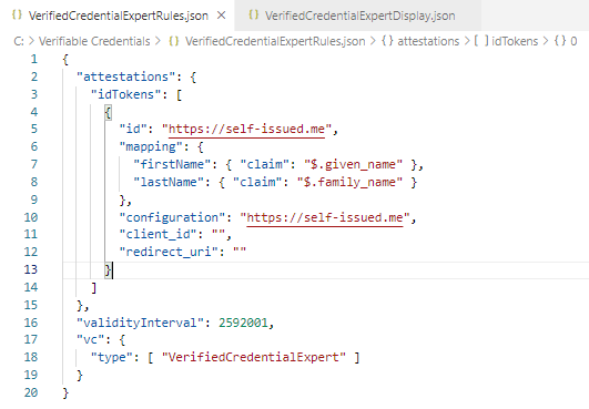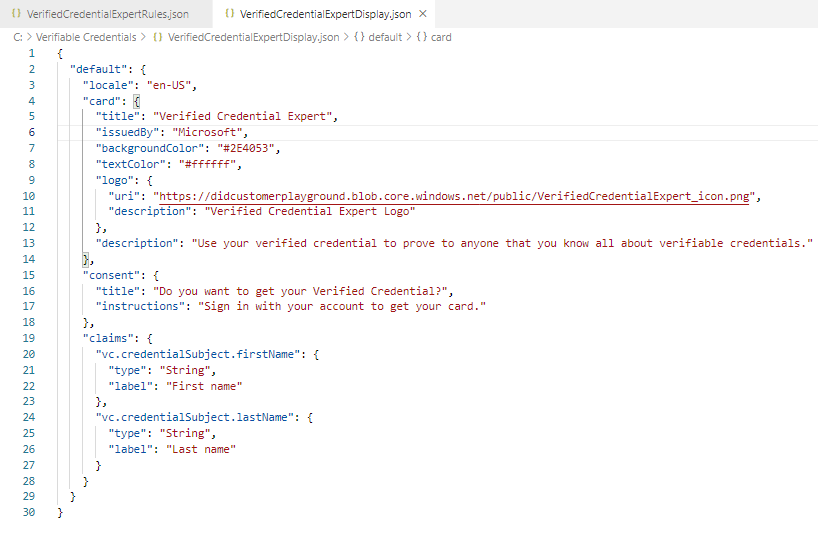 Azure AD Verifiable Credentials uses two JSON configuration files, the rules file and the display file.
