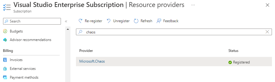- In the list of resource providers that appears, search for Microsoft.Chaos.