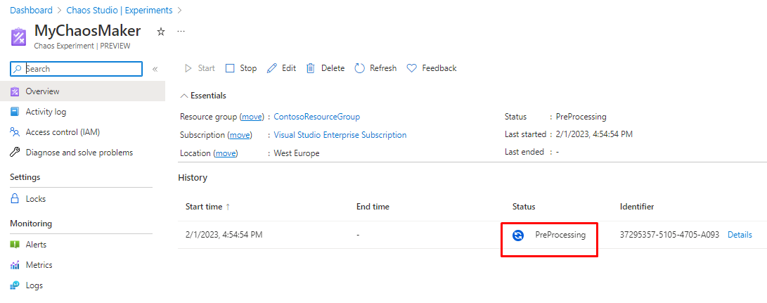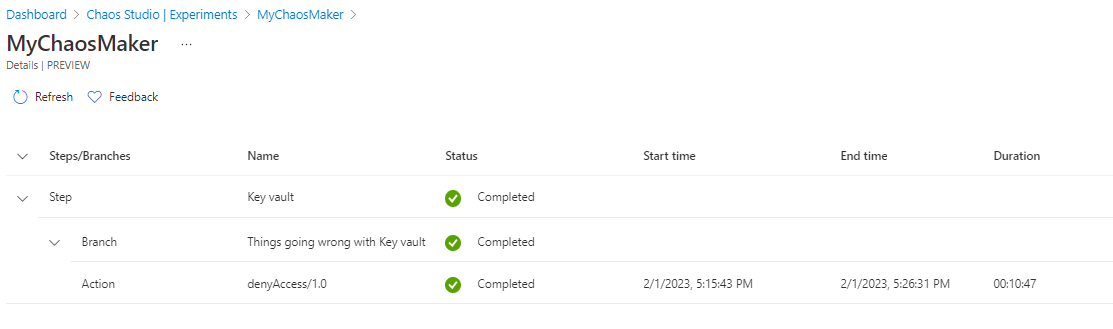 Once done start to invoke the Logic. An experiment is divided into steps that are performed one after the other. Each step has one or more concurrently running branches. Steps and branches enable you to simultaneously inject multiple faults across resources in your environment.