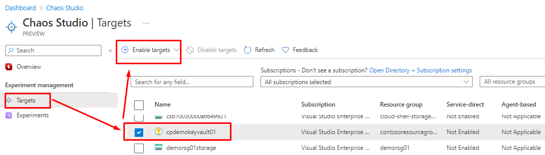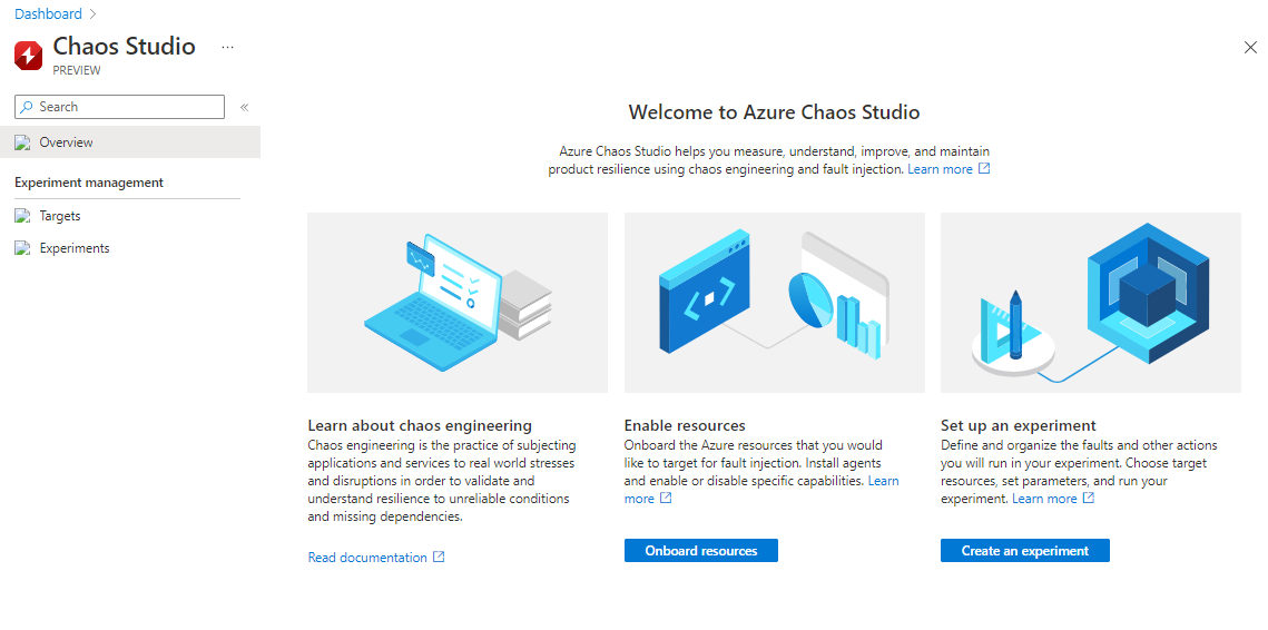 Once done, open Chaos Studio from https://portal.azure.com/#view/Microsoft_Azure_Chaos/ChaosStudioMenuBlade/~/overview/defaultMenuItem/chaosExperiment