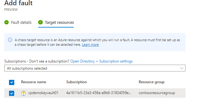 Add a target for the Fault. A chaos target allows Chaos Studio to interact with a specific target type's resource. The method of injecting faults against a resource is represented by a target type.