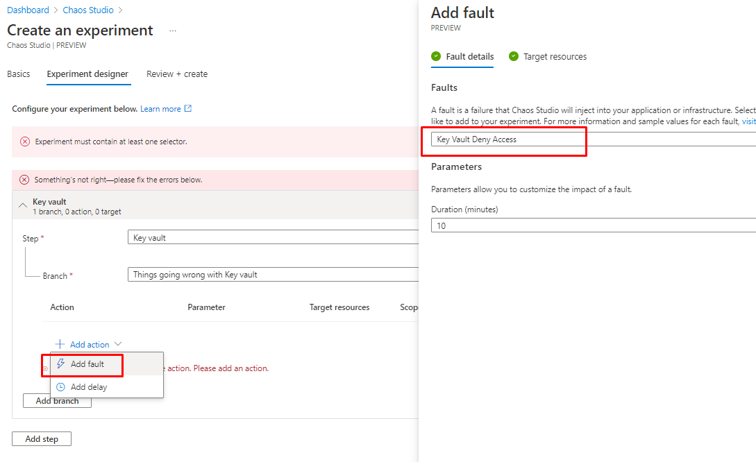 Then you proceed to add a Fault to the logic. Every activity that occurs as part of an experiment is referred to as an action in Chaos Studio, and the most common type of action is a fault.