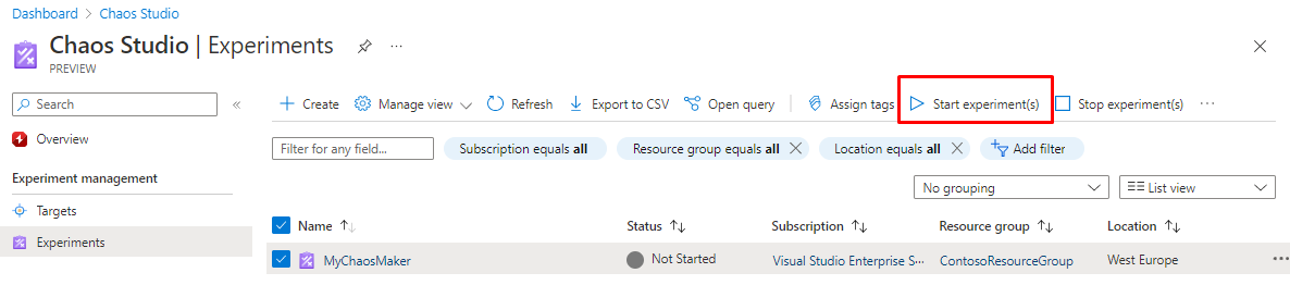 If you are using Chaos Studio for the first time, you must first register the Chaos Studio resource provider before on-boarding resources and creating an experiment. This must be done for each subscription where Chaos Studio will be used.