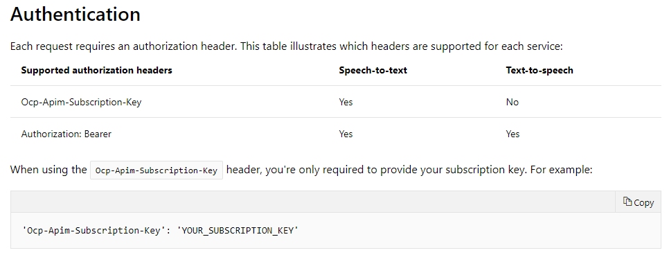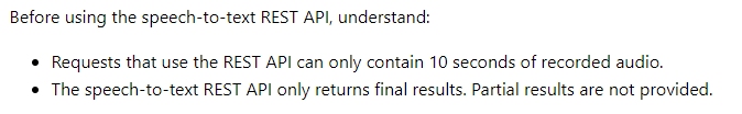 Spoiler alert as a formula "+44 = 16khz * 16 bits * 600 seconds + 44 = 160002*600+44 = 19200044" (I will open this one later, maybe) So, then I started to try this and that, first with Powershell. Generating Azure Speech API Key (There is two keys generated, but only one is needed for auth) I got this one working with under 15sec wav-file in 16khz. It translated the speech well enough, but the lenght was too short. A hint for the powershell usage with invoke-restmethod and Api Key. You have to put key inside {} to get it working, for some reason Azure declined the without these brackets. $Headers = @{ 'Ocp-Apim-Subscription-Key' = {Speech API KEY}; 'Transfer-Encoding' = 'chunked'; 'Content-type' = 'audio/pcm; codec=audio/pcm; samplerate=16000' } Although, Microsoft is saying in the documentation that rest-api and subscription key have to be put in 'key' format, but nope. Just no.