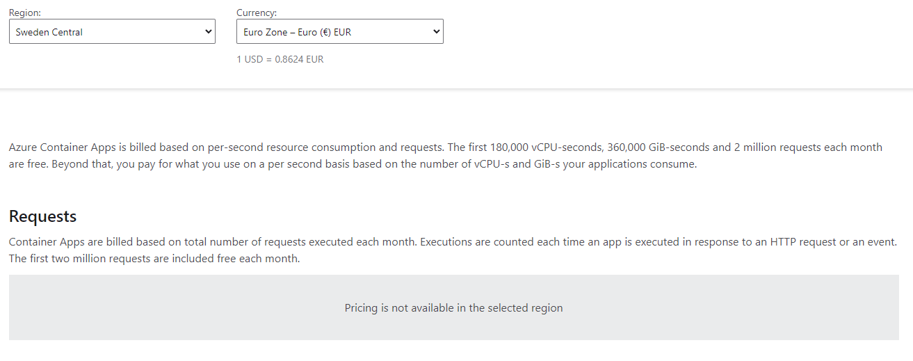 Container Apps are billed based on resource consumption measured in vCPU seconds and gibibyte seconds (GiB-s). The first 180,000 vCPU-seconds and 360,000 GiB-seconds each month are free. Active usage occurs while your container is starting or while there is at least one request being processed by the application. By default, applications scale to zero. You can also configure Container Apps with a minimum number of instances to be always running in idle mode. Idle usage is charged at a reduced rate when the application isn’t processing any requests.