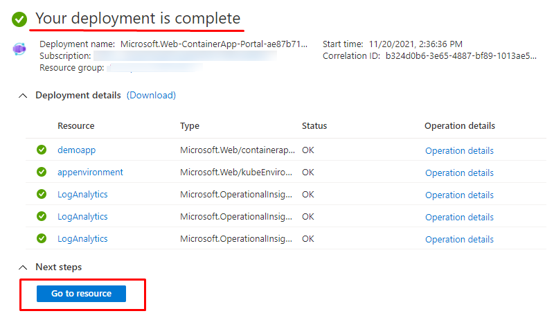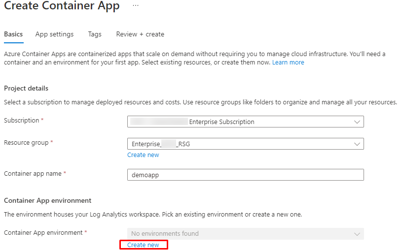 Choose your subscription and create a resource group or use existing. Then create App environment.