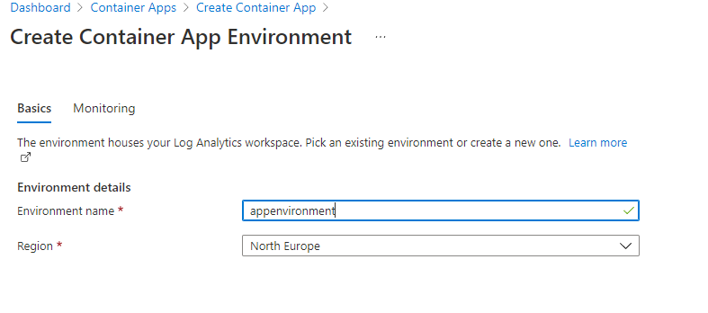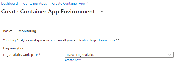 The apps environment will Log analytics so you can again use existing or create a new one.