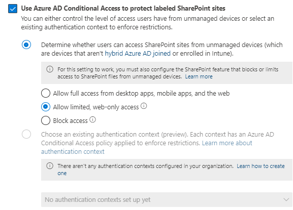And then apply conditional access to the same sites and groups, example for unmanaged (not compliant devices) you can force only web access, how easy is that. Just bare in mind that these settings will overtake the ones in SharePoint and Teams.