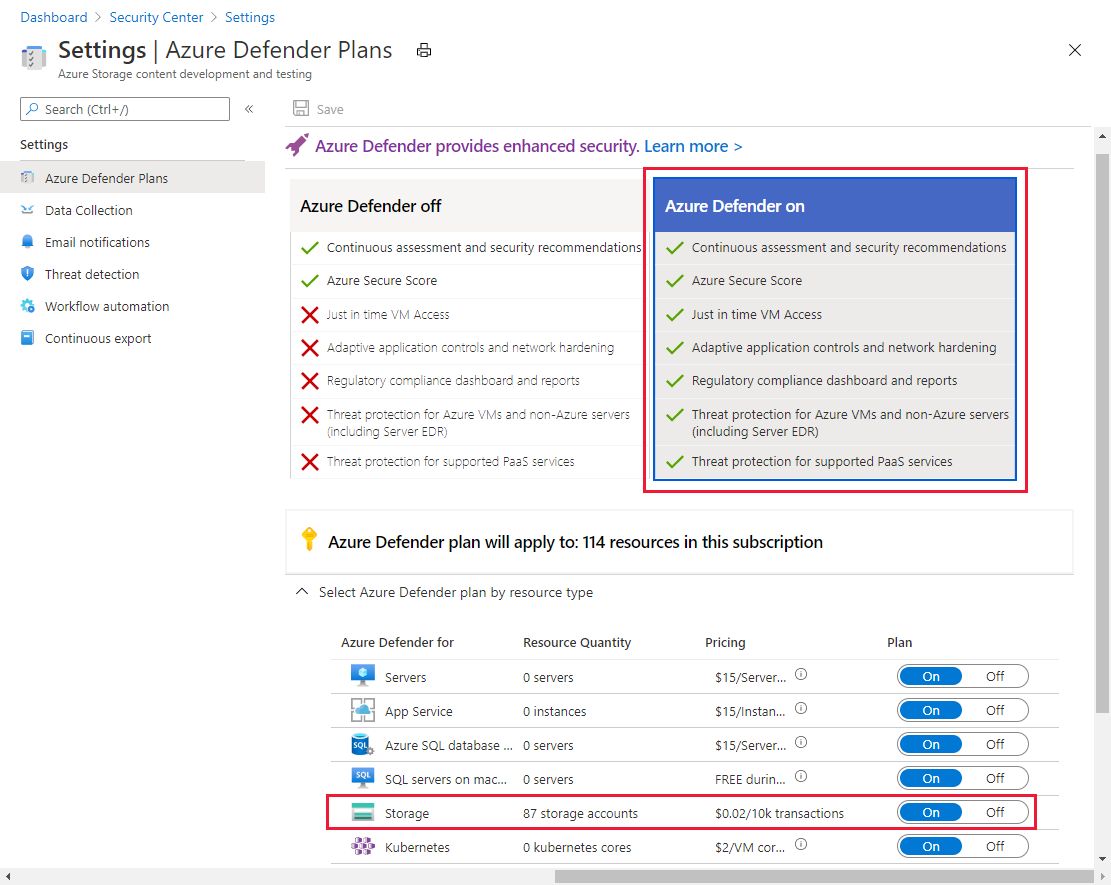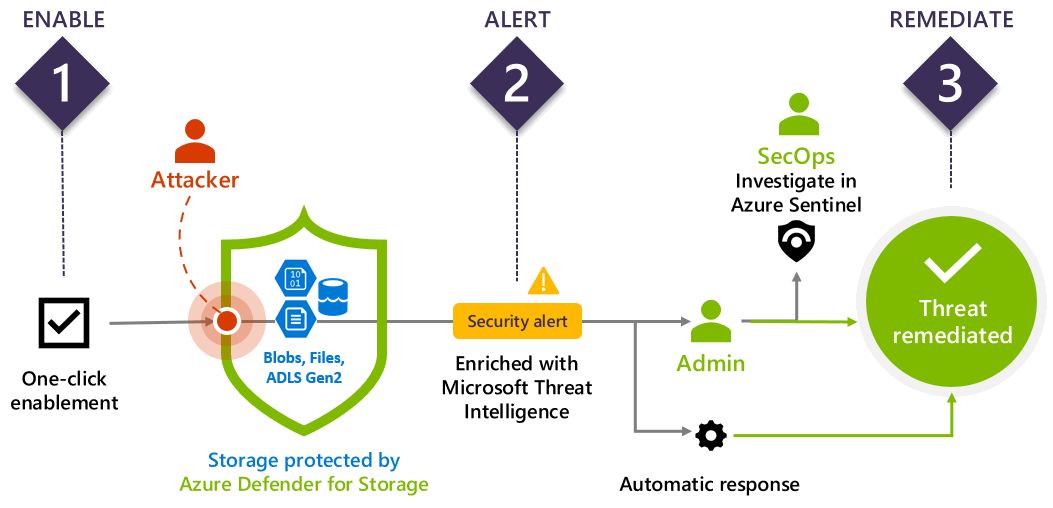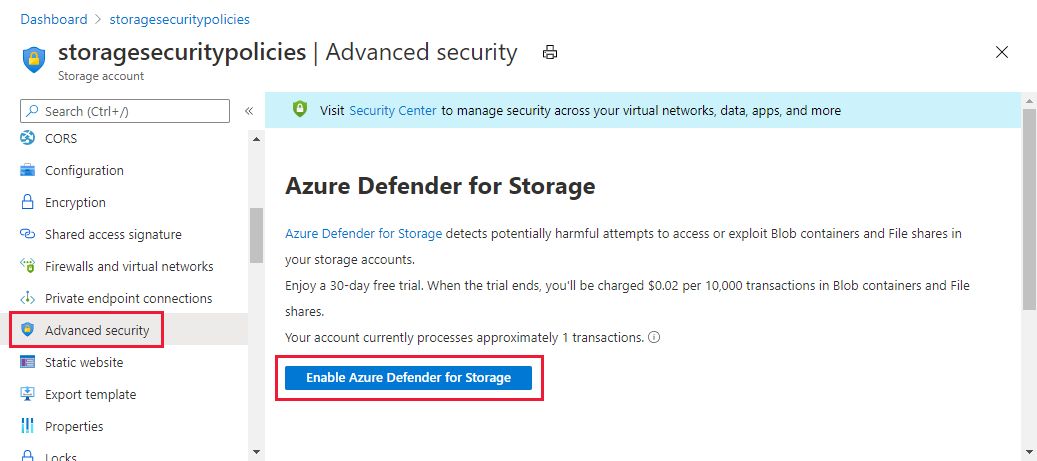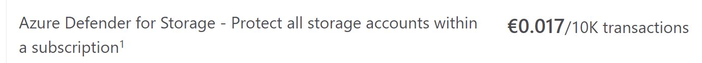 More information in MSFT Docs https://docs.microsoft.com/en-us/azure/storage/common/azure-defender-storage-configure When You enable it, you can monitor the unlawful access within Azure Security Center or get alerts triggered based on rules. https://docs.microsoft.com/en-us/azure/security-center/alerts-reference#alerts-azurestorage Defender for Storage isn't free but it could save our data and your day. For European customers and in Euros it's it.
