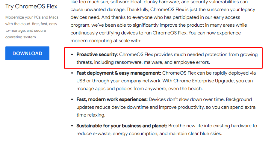 "ChromeOS Flex provides much needed protection from growing threats, including ransomware, malware, and employee errors."