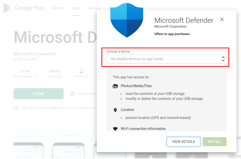 You cannot install Company portal or Defender for Android from Google Play because of it.