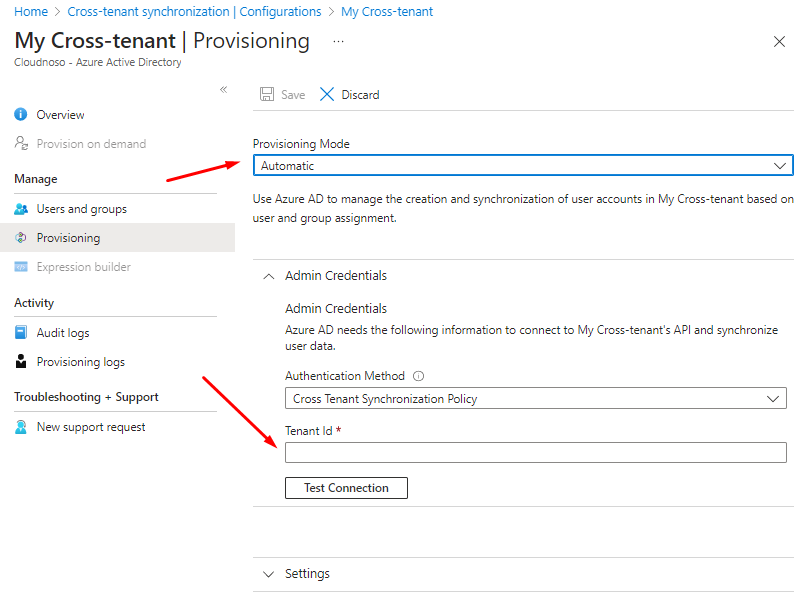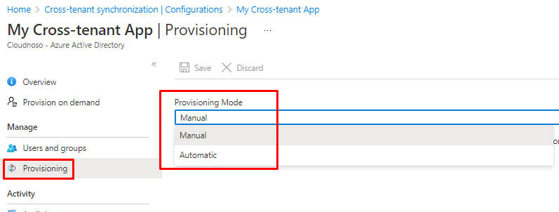 In the source add cross-tenant sync application and switch mode to Automatic
