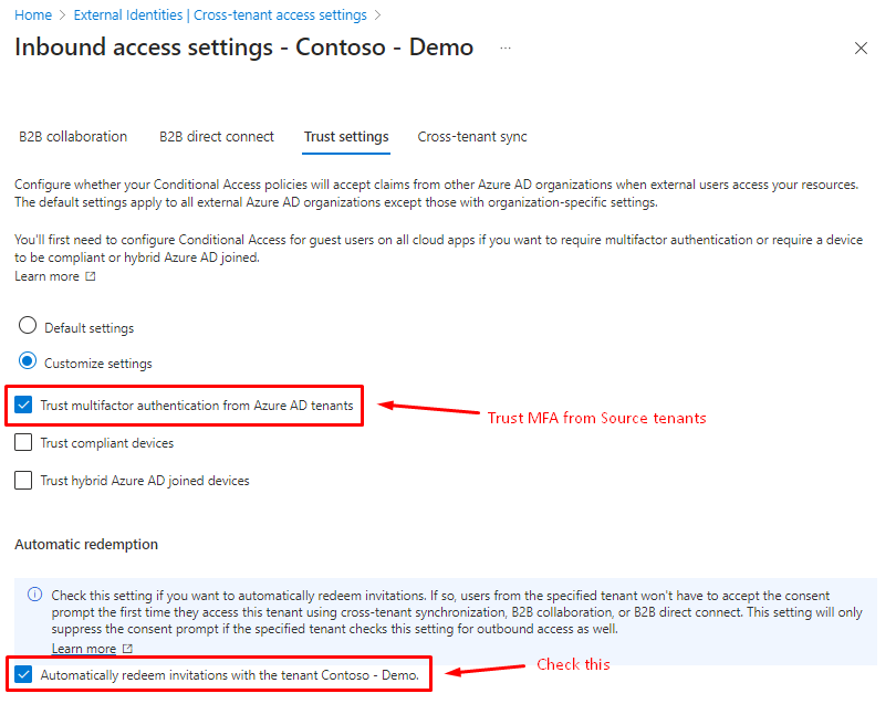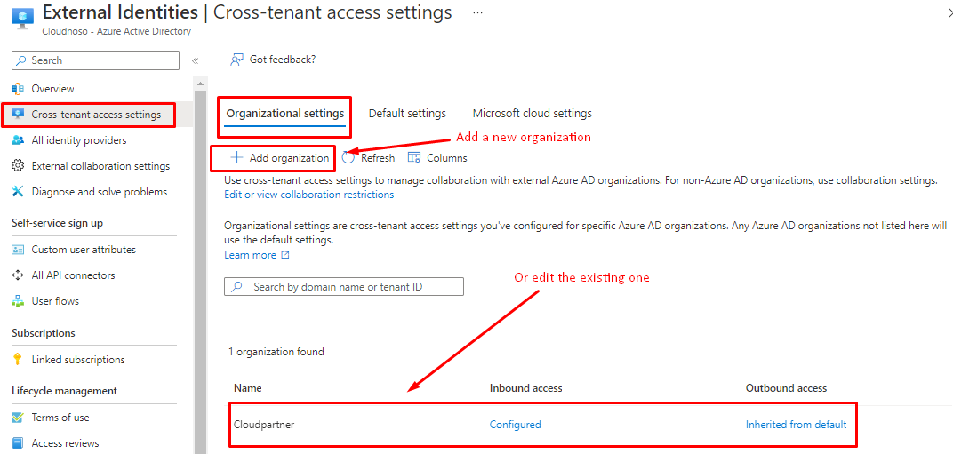 Again jumping back to Azure portal and now under https://portal.azure.com/#view/Microsoft_AAD_IAM/CompanyRelationshipsMenuBlade/~/CrossTenantAccessSettings