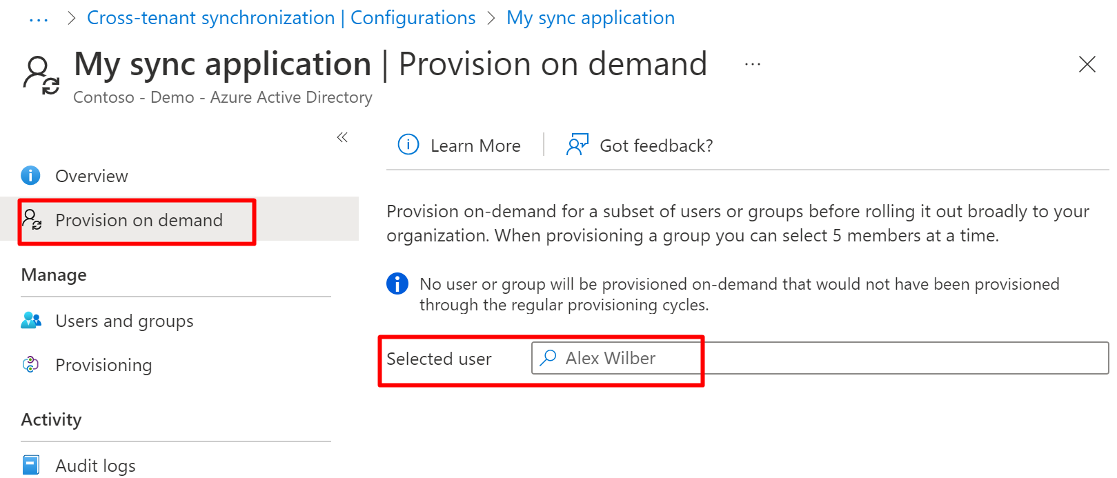 You can test out the provisioning from Provision on demand with 5 selected users at the time