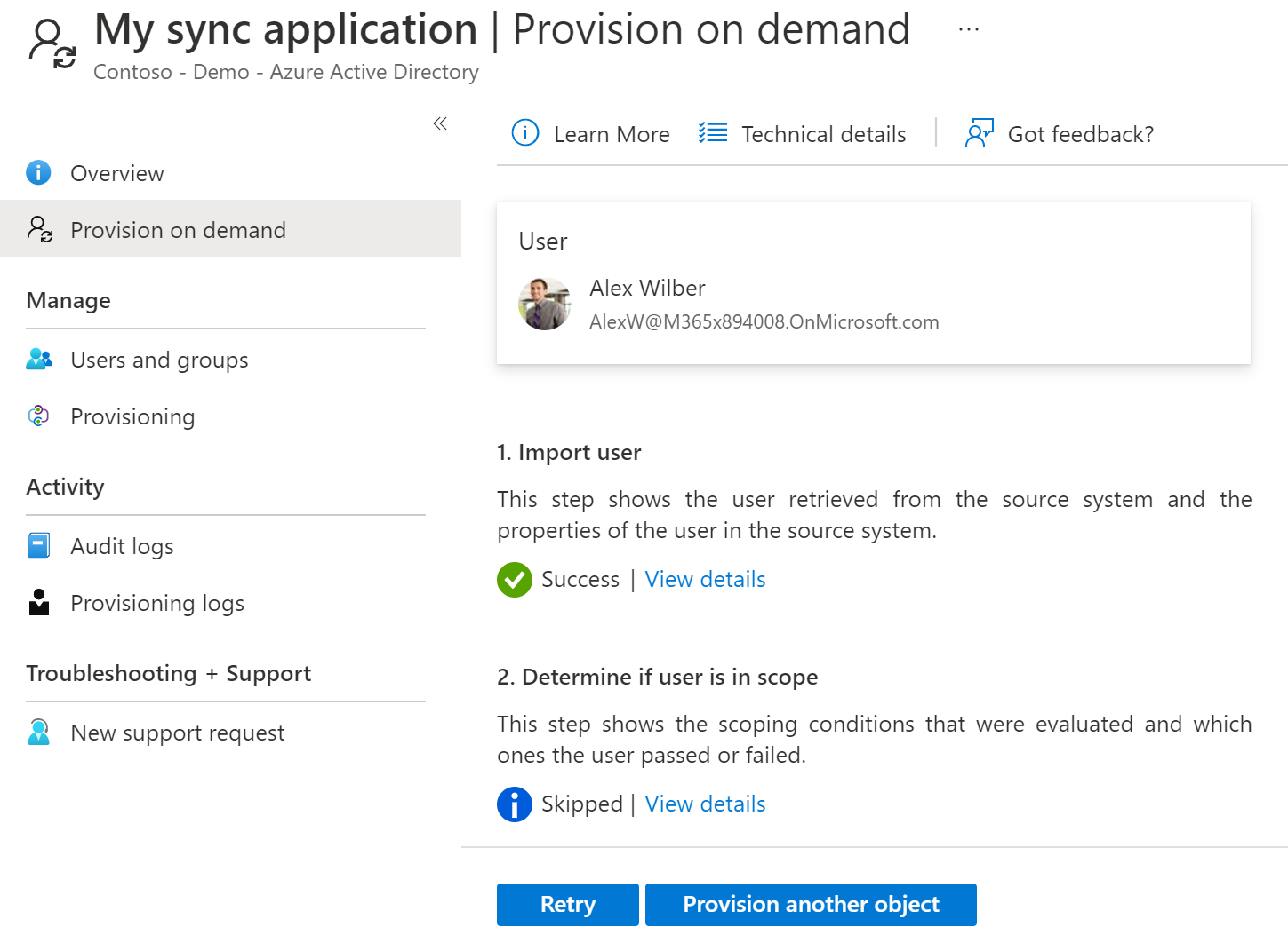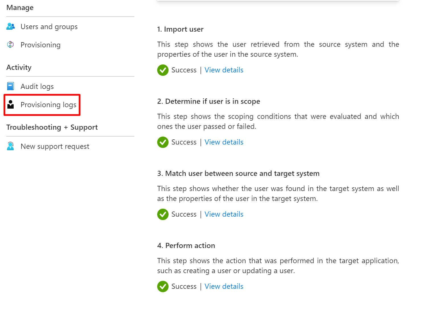 Once the user is provisioned, you will the status of the different parts inside the status page and the provisioning logs are one the left side