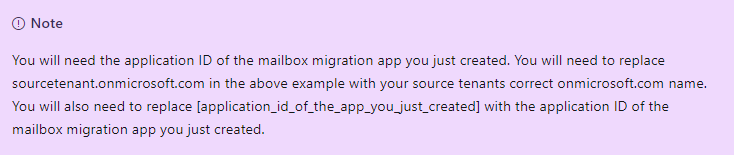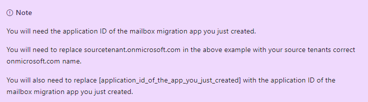 # The tenant ID that you enter as the $sourceTenantId and $targetTenantId is the GUID and not the tenant domain name. $targetTenantId="" $appId="" $scope="" $orgrels=Get-OrganizationRelationship $existingOrgRel = $orgrels | ?{$_.DomainNames -like $targetTenantId} If ($null -ne $existingOrgRel) { Set-OrganizationRelationship $existingOrgRel.Name -Enabled:$true -MailboxMoveEnabled:$true -MailboxMoveCapability RemoteOutbound -OAuthApplicationId $appId -MailboxMovePublishedScopes $scope } If ($null -eq $existingOrgRel) { New-OrganizationRelationship "" -Enabled:$true -MailboxMoveEnabled:$true -MailboxMoveCapability RemoteOutbound -DomainNames $targetTenantId -OAuthApplicationId $appId -MailboxMovePublishedScopes $scope }Migration