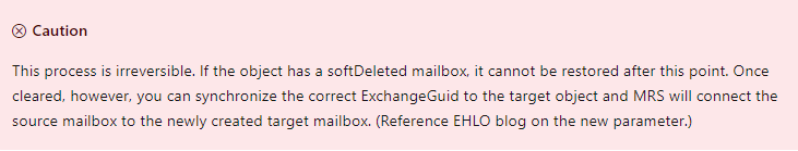 If the target MailUser was previously licensed for or had an ExchangeGuid that does not match the Source ExchangeGuid, you need to perform a cleanup of the cloud MEU. For these cloud MEUs, you can run