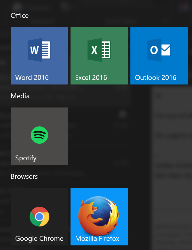 <LayoutModificationTemplate xmlns:defaultlayout="http://schemas.microsoft.com/Start/2014/FullDefaultLayout" xmlns:start="http://schemas.microsoft.com/Start/2014/StartLayout" Version="1" xmlns="http://schemas.microsoft.com/Start/2014/LayoutModification"> <LayoutOptions StartTileGroupCellWidth="6" /> <DefaultLayoutOverride> <StartLayoutCollection> <defaultlayout:StartLayout GroupCellWidth="6"> <start:Group Name="Office"> <start:DesktopApplicationTile Size="2x2" Column="0" Row="0" DesktopApplicationLinkPath="%ALLUSERSPROFILE%\Microsoft\Windows\Start Menu\Programs\Word 2016.lnk" /> <start:DesktopApplicationTile Size="2x2" Column="2" Row="0" DesktopApplicationLinkPath="%ALLUSERSPROFILE%\Microsoft\Windows\Start Menu\Programs\Excel 2016.lnk" /> <start:DesktopApplicationTile Size="2x2" Column="4" Row="0" DesktopApplicationLinkPath="%ALLUSERSPROFILE%\Microsoft\Windows\Start Menu\Programs\Outlook 2016.lnk" /> </start:Group> <start:Group Name="Media"> <start:DesktopApplicationTile Size="2x2" Column="0" Row="0" DesktopApplicationLinkPath="%APPDATA%\Microsoft\Windows\Start Menu\Programs\Spotify.lnk" /> </start:Group> <start:Group Name="Browsers"> <start:DesktopApplicationTile Size="2x2" Column="0" Row="0" DesktopApplicationLinkPath="%ALLUSERSPROFILE%\Microsoft\Windows\Start Menu\Programs\Google Chrome.lnk" /> <start:DesktopApplicationTile Size="2x2" Column="2" Row="0" DesktopApplicationLinkPath="%ALLUSERSPROFILE%\Microsoft\Windows\Start Menu\Programs\Mozilla Firefox.lnk" /> </start:Group> </defaultlayout:StartLayout> </StartLayoutCollection> </DefaultLayoutOverride> <CustomTaskbarLayoutCollection PinListPlacement="Replace"> <defaultlayout:TaskbarLayout> <taskbar:TaskbarPinList> <taskbar:DesktopApp DesktopApplicationLinkPath="%APPDATA%\Microsoft\Windows\Start Menu\Programs\System Tools\computer.lnk" /> <taskbar:DesktopApp DesktopApplicationLinkPath="%ALLUSERSPROFILE%\Microsoft\Windows\Start Menu\Programs\Google Chrome.lnk" /> <taskbar:DesktopApp DesktopApplicationLinkPath="%ALLUSERSPROFILE%\Microsoft\Windows\Start Menu\Programs\Microsoft Office\Outlook 2016.lnk" /> <taskbar:DesktopApp DesktopApplicationLinkPath="%ALLUSERSPROFILE%\Microsoft\Windows\Start Menu\Programs\Microsoft Office\Word 2016.lnk" /> <taskbar:DesktopApp DesktopApplicationLinkPath="%ALLUSERSPROFILE%\Microsoft\Windows\Start Menu\Programs\Microsoft Office\PowerPoint 2016.lnk" /> </taskbar:TaskbarPinList> </defaultlayout:TaskbarLayout> </CustomTaskbarLayoutCollection> </LayoutModificationTemplate>The way I have used this for example in an OSD deployment through SCCM, is to run this in the last step of the Task Sequence with a Powershell script. The script simply imports the modifications to the default user profile, so it automatically imports it to everyone, who logs in to the computer after installation.