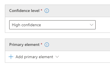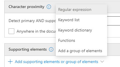 And supporting elements. Adding supporting elements increases the likelihood that the detected info is a true match. For example, let's say you want to detect nine-digit employee ID numbers. Not all nine-digit numbers are employee ID numbers, so you can add supporting elements to look for related text near the ID numbers, such as keywords like "employee", "badge", and "ID". When the primary element is matched, any supporting elements will match only when found within the character proximity to the primary element.