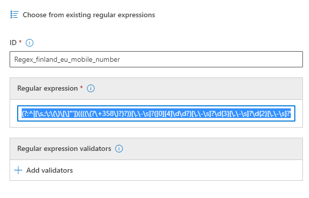 Microsoft has defined multiple different RegEx queries. I will choose the one with Finnish telephone number.