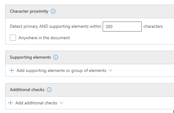 When the primary element is matched, any supporting elements will match only when found within this proximity to the primary element. The closer the primary and supporting elements are to each other, the more likely the detected content is going to be what you're looking for.