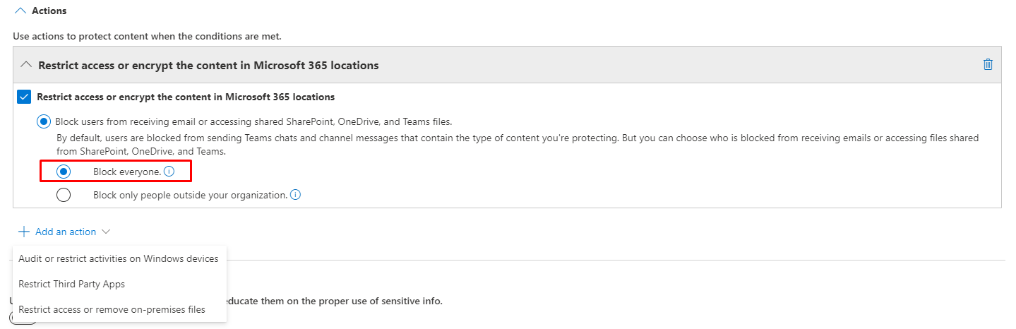 And it means that Exchange email won't be sent to recipients inside or outside your organization. For files in SharePoint, OneDrive, and teams, only the owner, last modifier, and site admin will have access.