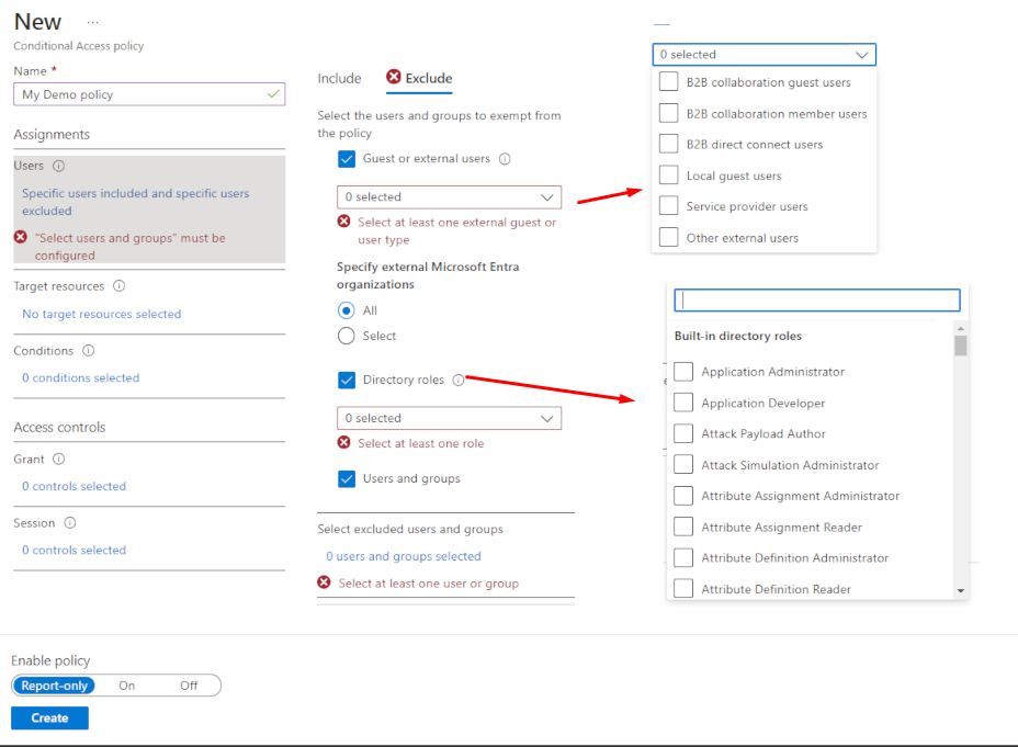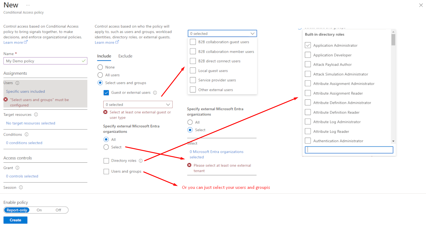 | Users & Groups | Define who the policy applies to (include/exclude): All users Specific user groups Directory roles External guests |