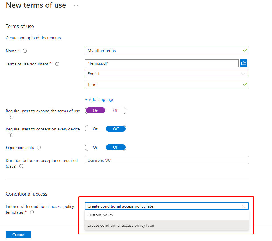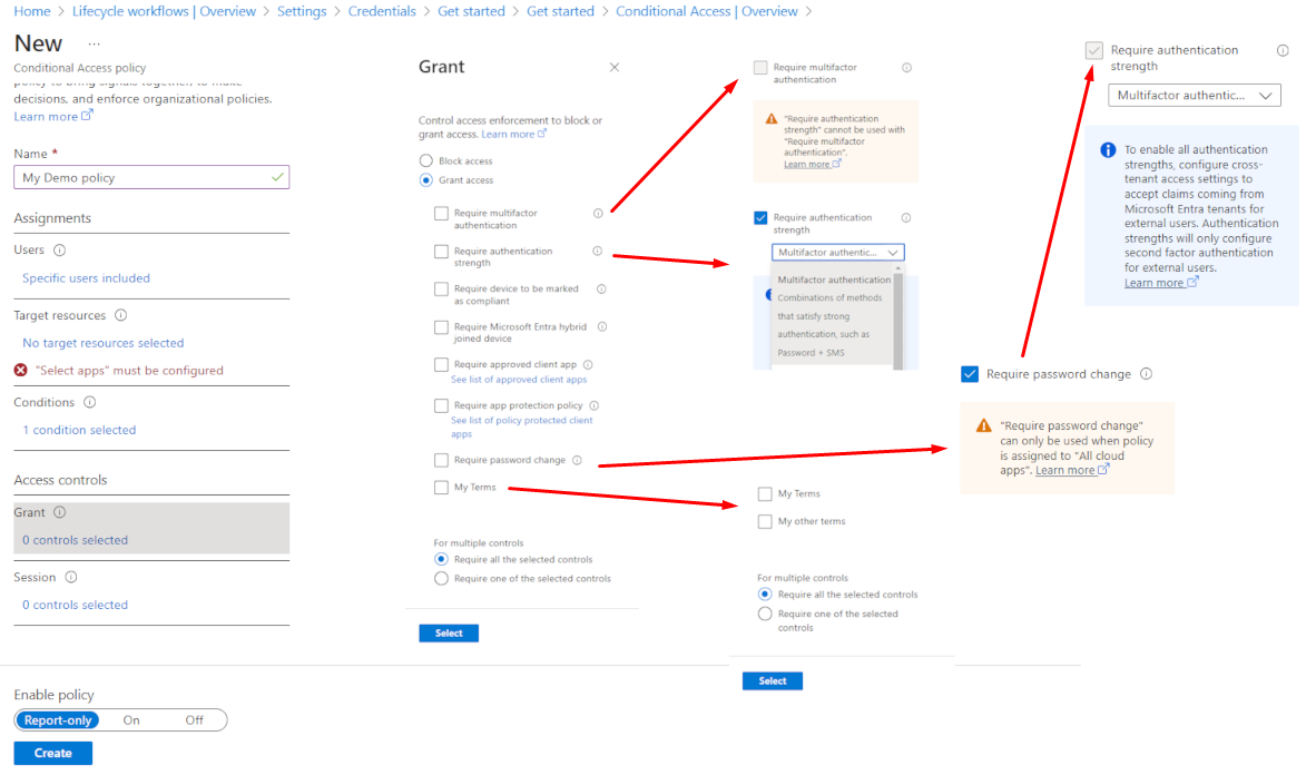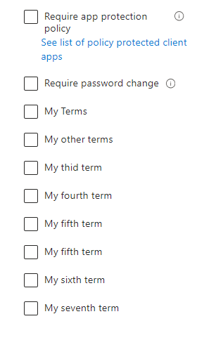 | Grant Access | Triggers enforcement of one or more controls: Require Multi-Factor Authentication (MFA) Require authentication strength Require device compliance Require Microsoft Entra hybrid joined device Require approved client app Require app protection policy Require password change Require terms of use acceptance |