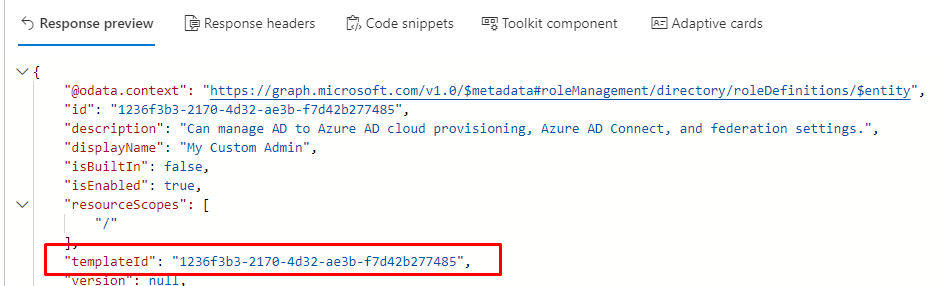 After the role is successfully created, you will get a template ID that you can use in new custom roles.