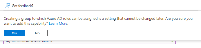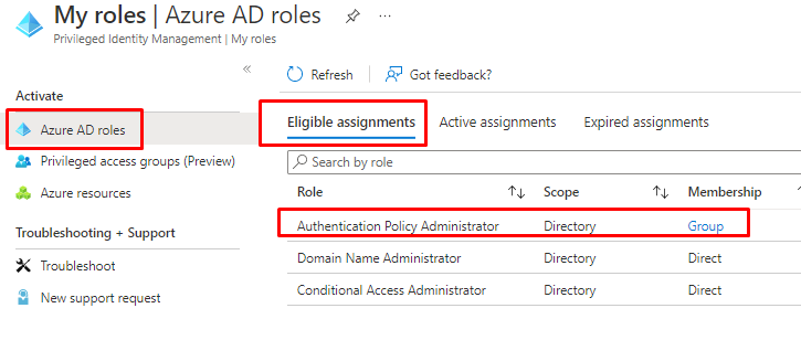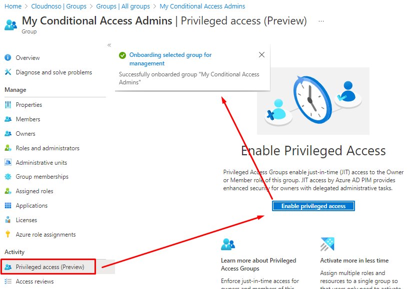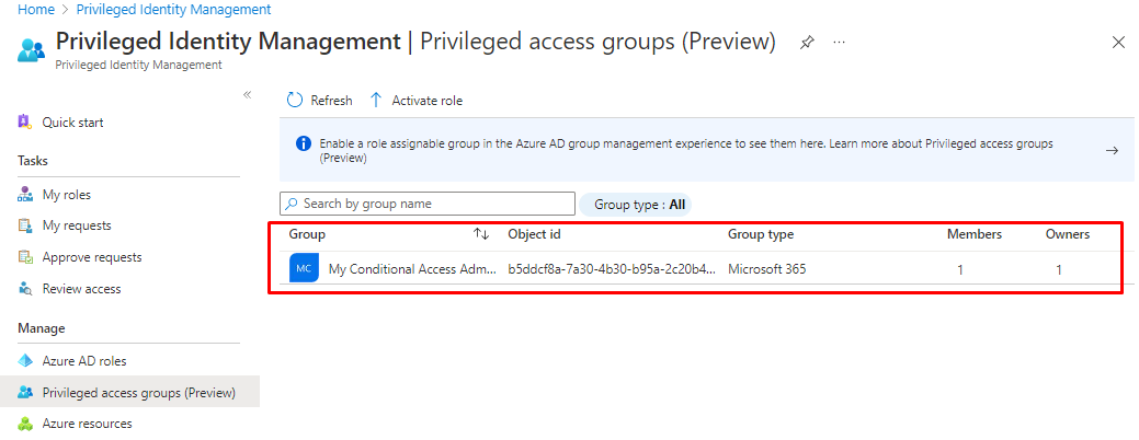 But use the Azure AD portal's Roles and Administrators experience rather than the Privileged Access Groups experience to make the user or group eligible for activation into the group if you want to assign a privileged access group to a role for administrative access to Exchange, Security & Compliance Center, or SharePoint.