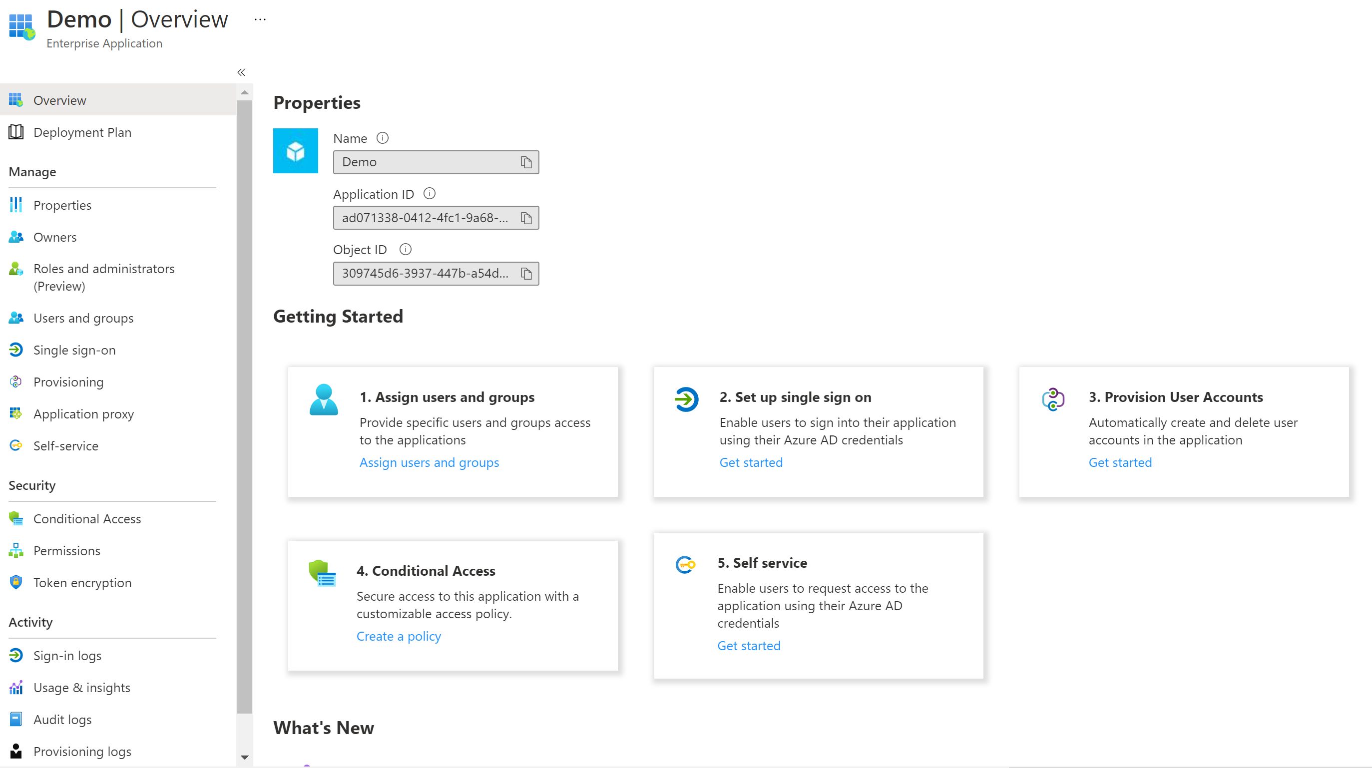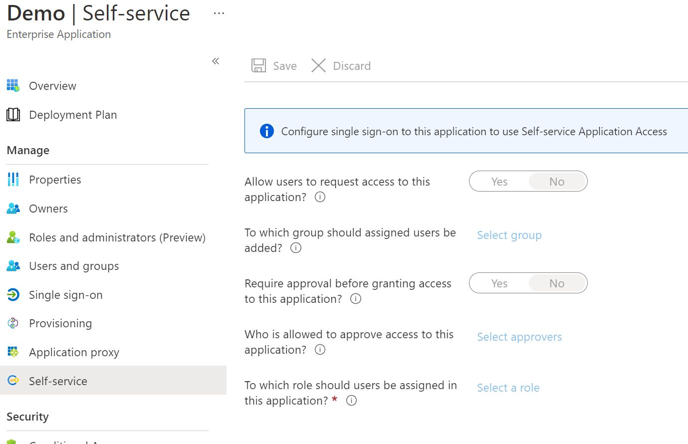 There you will find the options above. I will not be covering them all, just opening up SSO and Self-Service and what is the difference with Enterprise app and App registration.