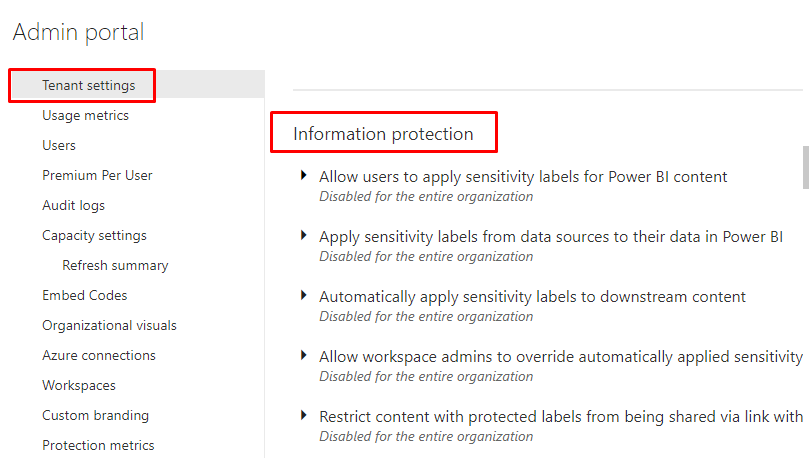 Under Allow users to apply sensitivity labels for Power BI content you will find the settings