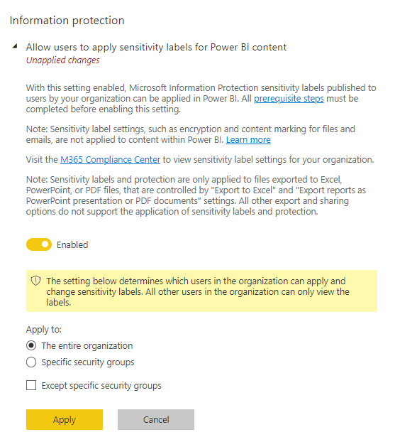 - You must belong to a security group that has permissions to apply sensitivity labels, as described in Enable sensitivity labels in Power BI.