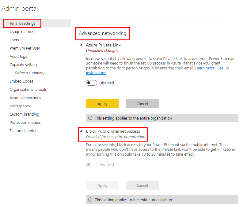 From tenant settings open Advanced networking and Enable Azure Private Link. When this is enabled You can disable the Public Internet access. Just remember that this is a settings for the whole tenant.