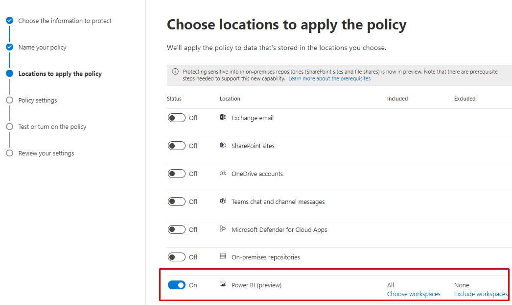 - DLP policies for Power BI are defined in the Microsoft 365 compliance portal.