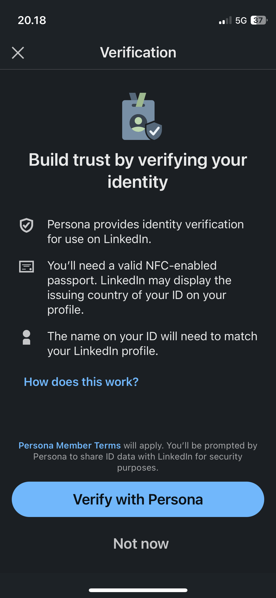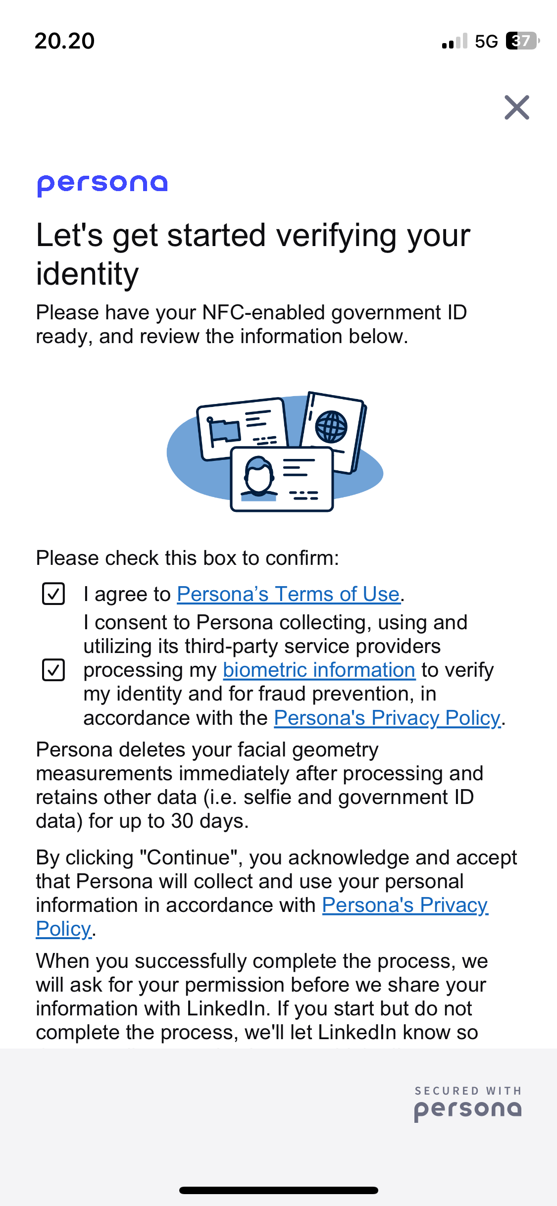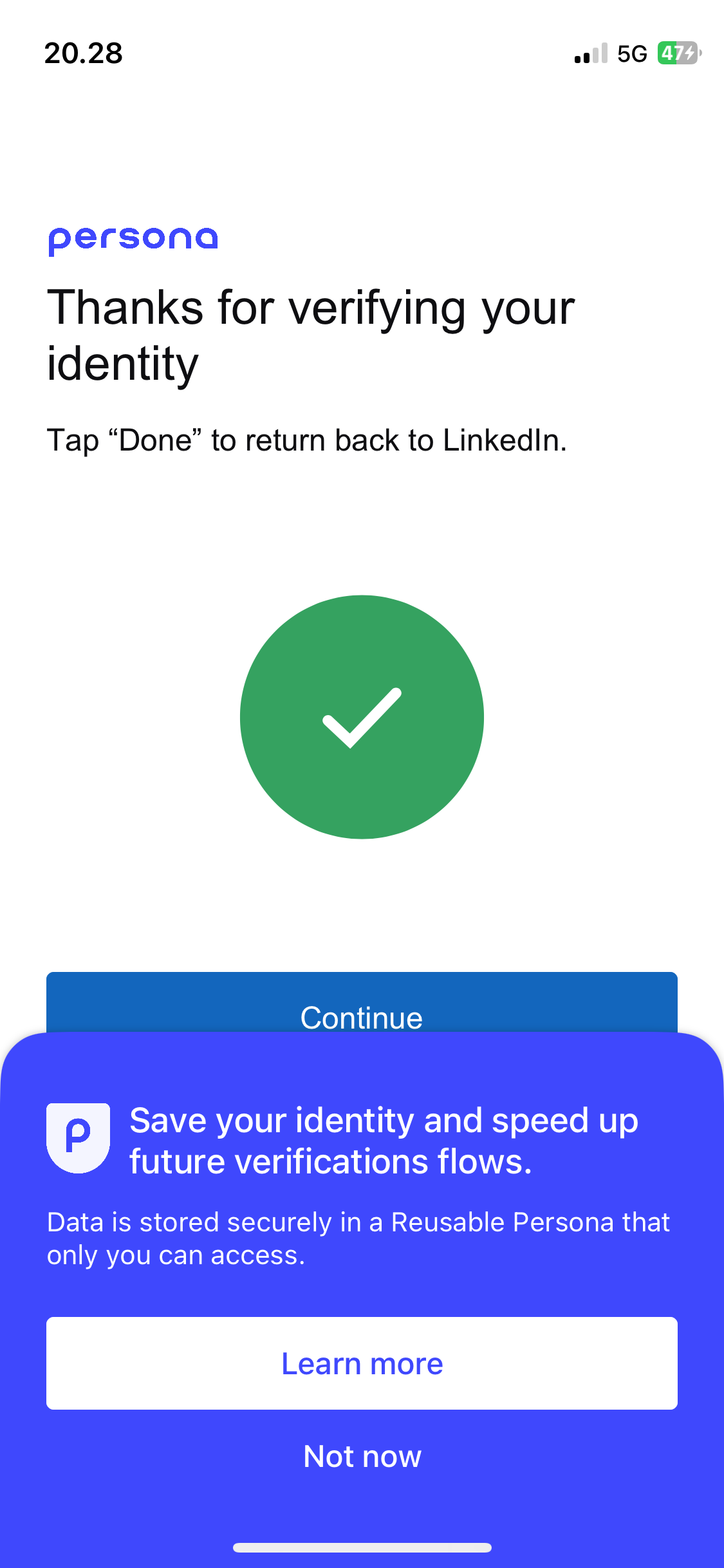 - You’ll be redirected to Persona’s verification process through the LinkedIn app. Steps include: