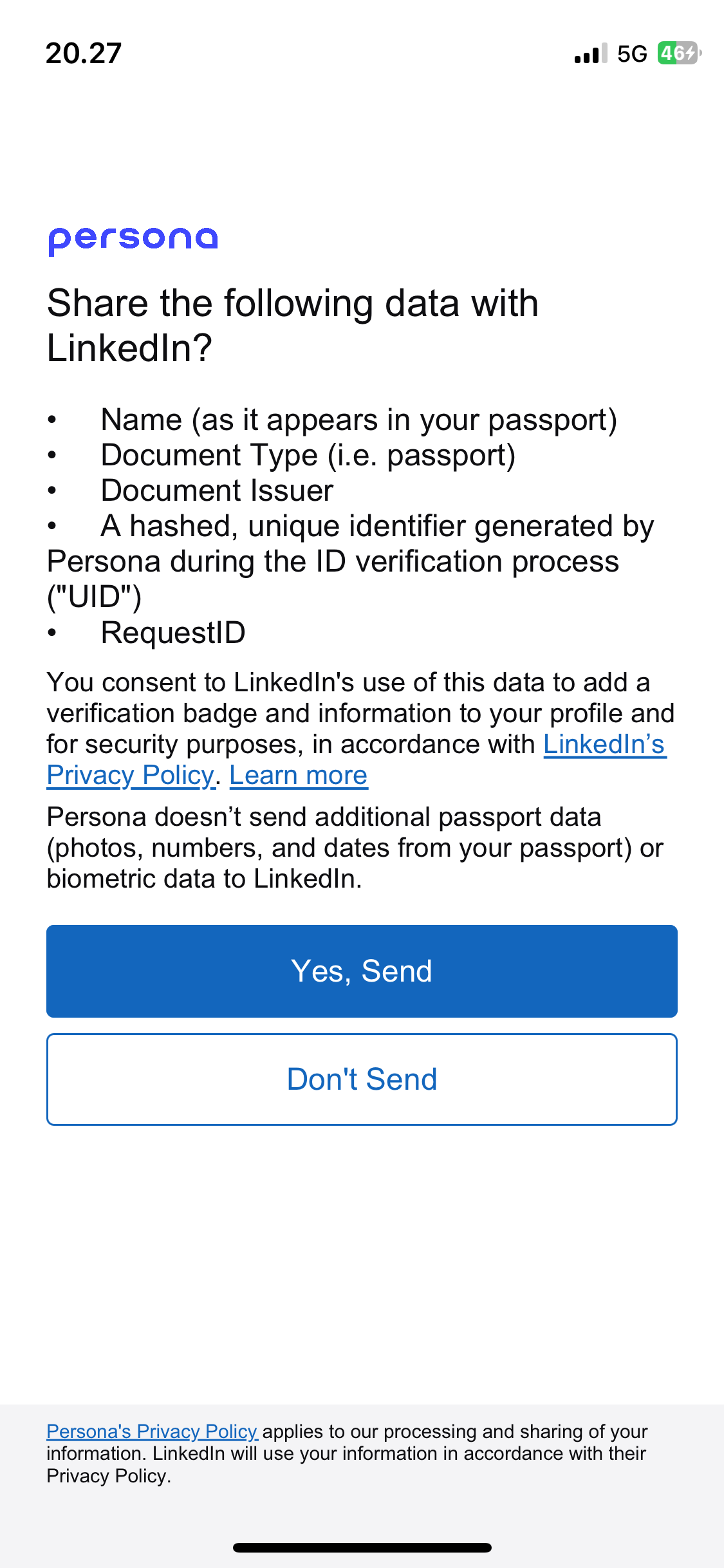 Data collection and sharing: Persona handles the personal data needed to verify your identity (including an image of your ID and a selfie), but LinkedIn will provide Persona with a hashed version of your LinkedIn Member ID to link the verification to your account. Persona shares the following with LinkedIn, with your consent: