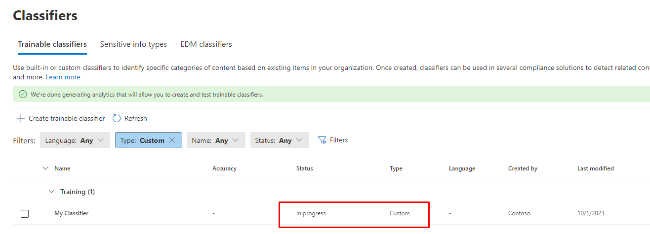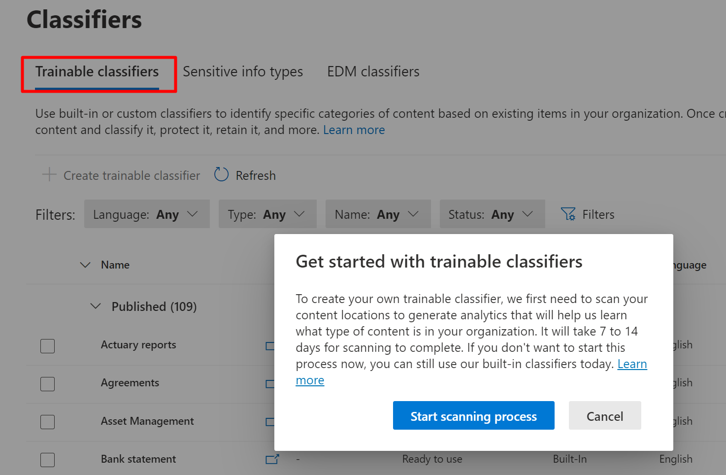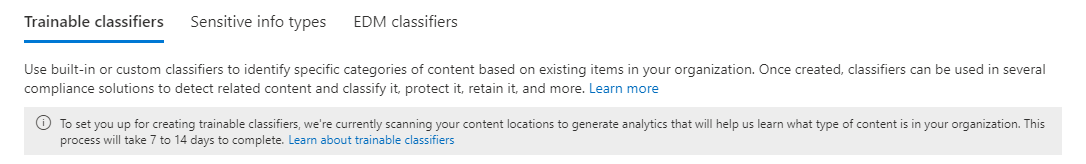 To develop a personalized trainable classifier for you, we'll begin by scanning your content locations to gather insights that will enable us to understand the content within your organization better. This scanning process is expected to conclude within 7 to 14 days.