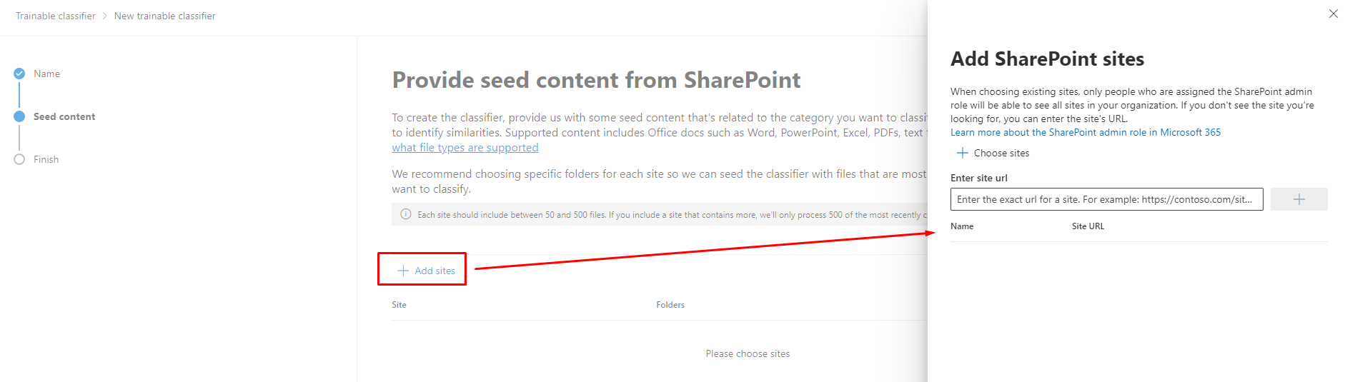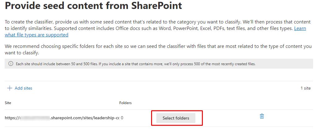 A minimum of 50 positive samples is required, and you can include up to a maximum of 500. The trainable classifier will consider the 500 most recently created samples, sorted by file creation date and time. Providing a greater number of samples enhances the classifier’s prediction accuracy.