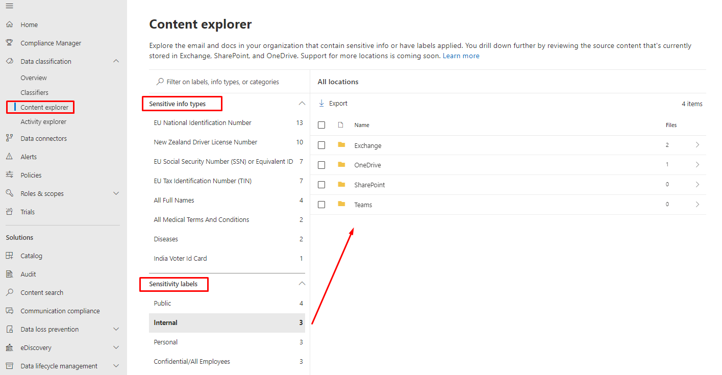 - Content Explorer: Provides visibility into sensitive data quantity and types, enabling filtering by label or sensitivity type for detailed location insights.
