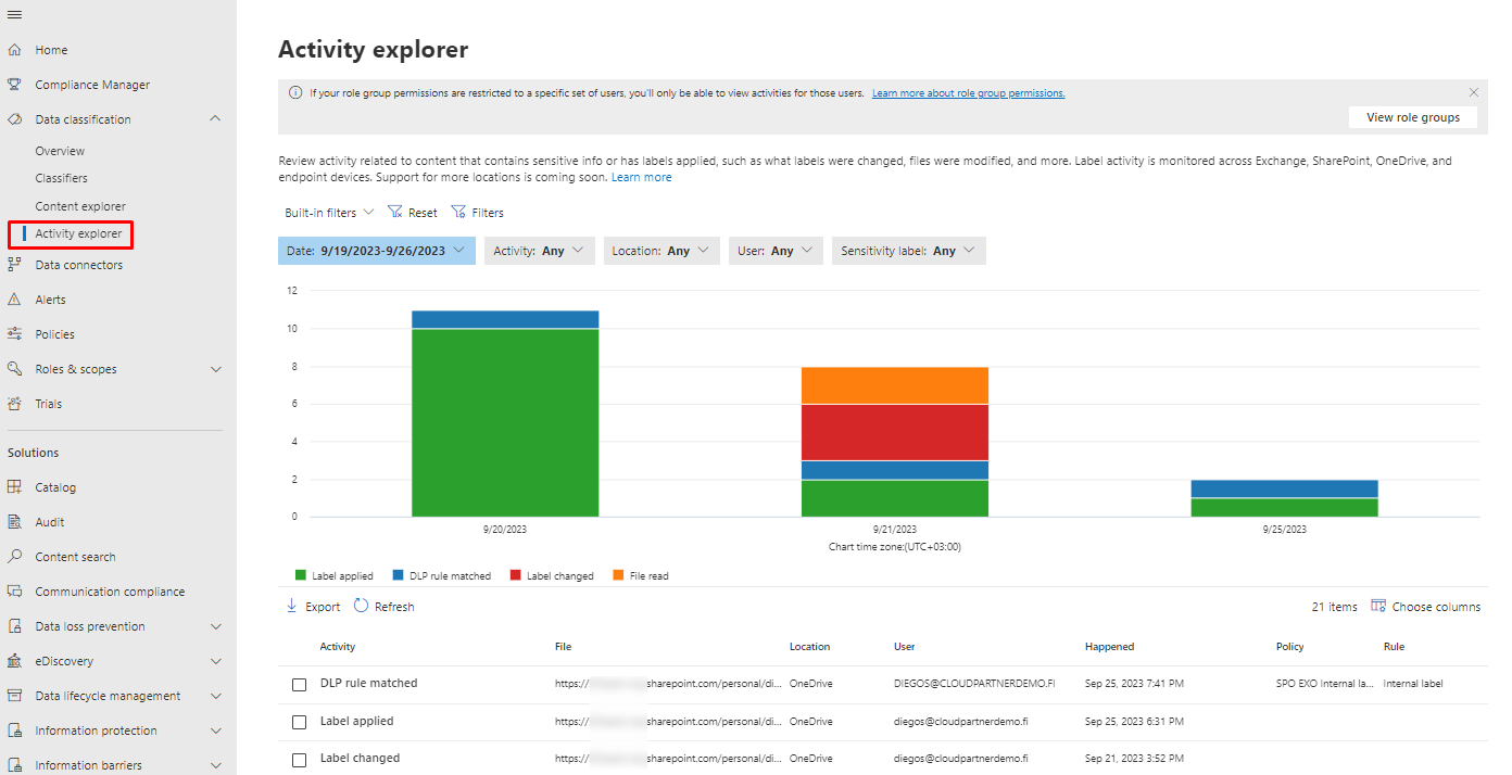 - Activity Explorer: Reveals activities tied to sensitive data and labels, including label changes and potential content exposure.