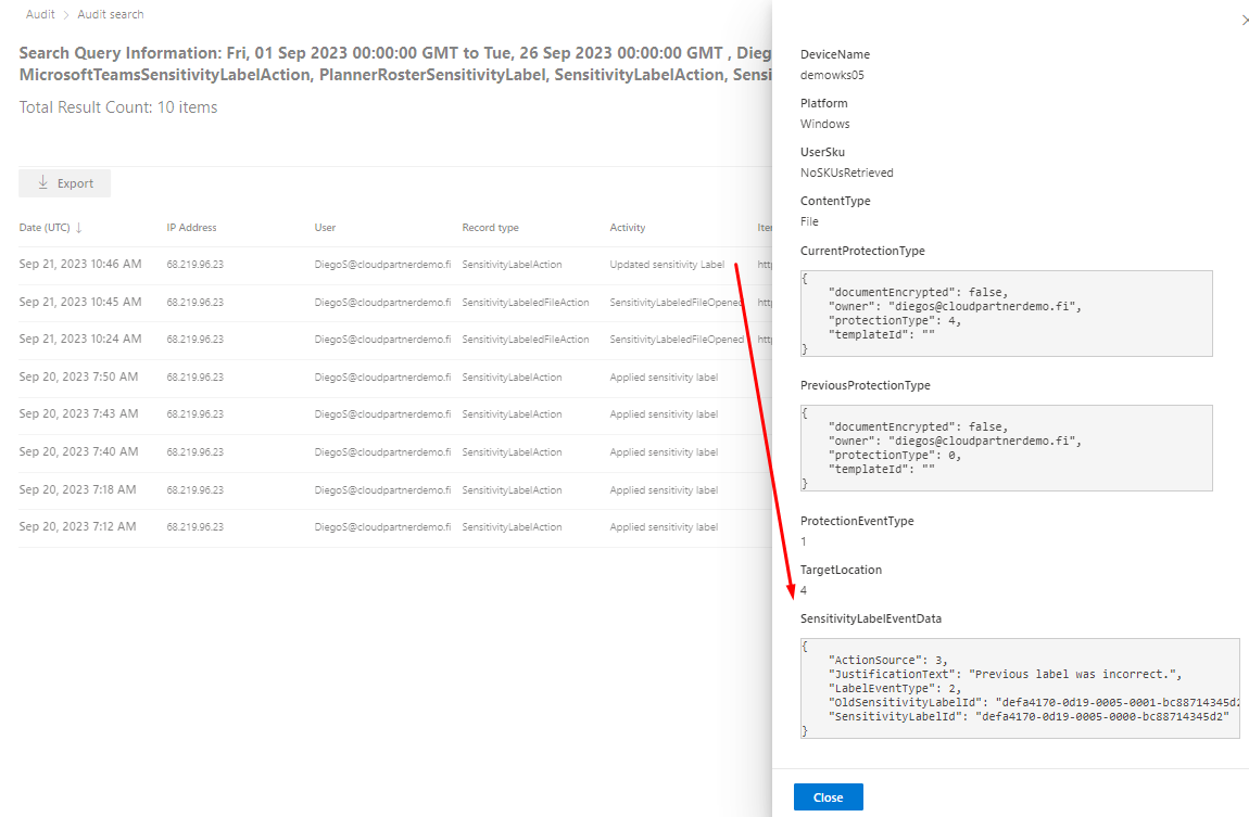 If you define a scope, you have way less hits from the Audit logs. In this example we have a user that lowered an label and you can see the Justification from the logs.