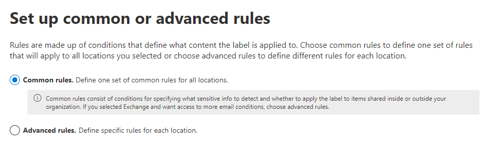 - New conditions are now generally available for auto-labeling policies. Just the final new condition listed requires an advanced rule, and is applicable to OneDrive and SharePoint only. All the other new conditions are available in common rules: