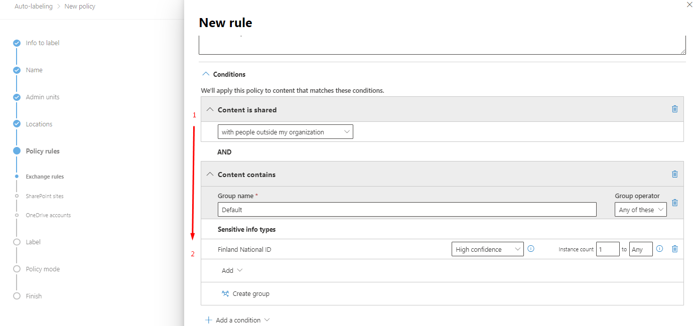 You can example label content that is Shared outside and has certain SITs in it. For this you have to first add the content shared and then content contain, otherwise the policy creation will fail.