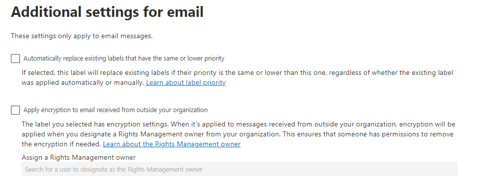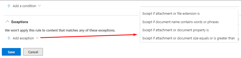 | Labeling conditions | Sensitive content; Content is shared; Recipient properties; Sender properties; Email subject; Document title; Attachment extension; Attachment can't be scanned; Attachment is encrypted; Email headers | Sensitive content in document or email body; Sensitive content in attachment |