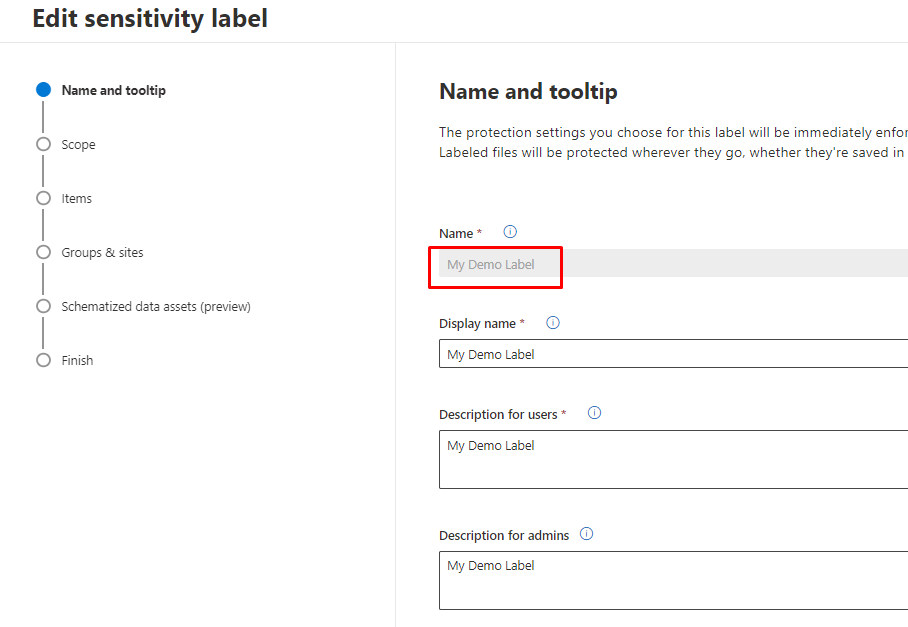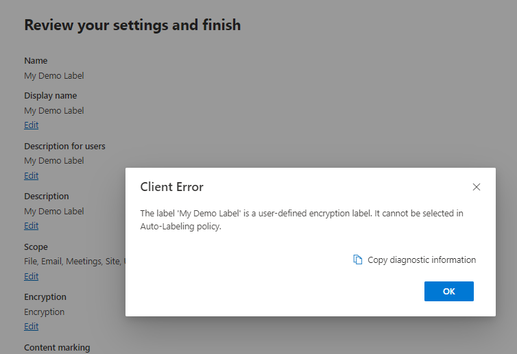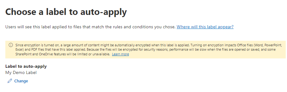 But if you have have the label in question assigned with an Auto-labeling policy, you cannot change the Encryption settings for the label before it is removed from the policy.