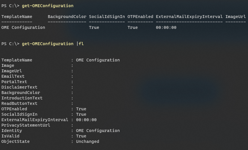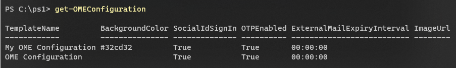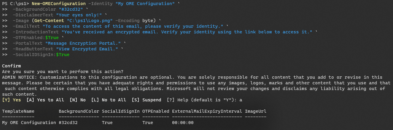 New-OMEConfiguration -Identity "My OME Configuration" ` -BackgroundColor "#32cd32" ` -DisclaimerText "Your eyes only!" ` -Image (Get-Content "C:\ps1\Logo.png" -Encoding byte) ` -EmailText "To access the content of this email, please verify your identity." ` -IntroductionText "You've received an encrypted email. Verify your identity using the link below to access it." ` -OTPEnabled:$True ` -PortalText "Message Encryption Portal." ` -ReadButtonText "View Encrypted Email." ` -SocialIDSignIn:$True